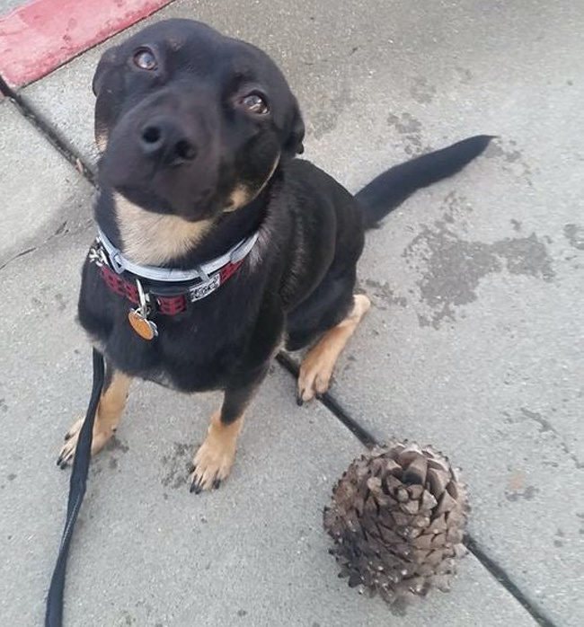 “Mi perro encontró un enorme cono de pino. ¡Está tan orgulloso que lo trajo para enseñármelo!”