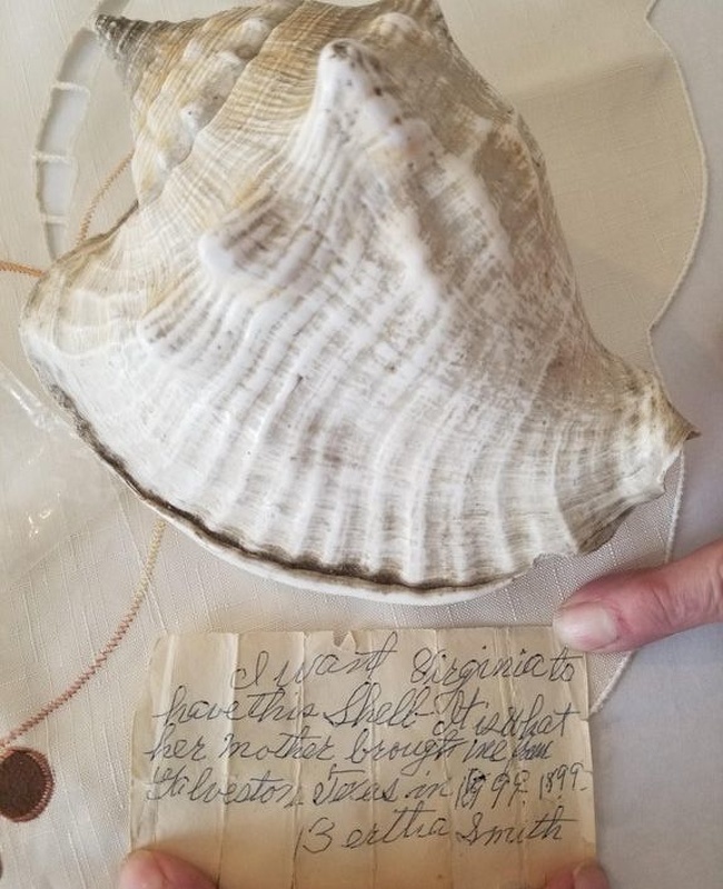 “Quiero que Virginia tenga esta concha. Me la trajo mi mamá de Galveston, Texas, en 1899. Bertha Smith”.
