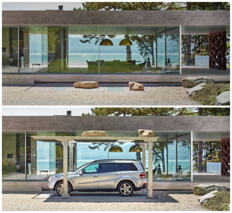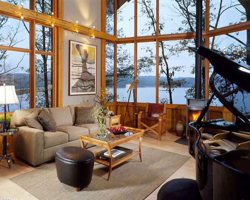 Casa del lago con paredes transparentes cerca ubicada en un bosque