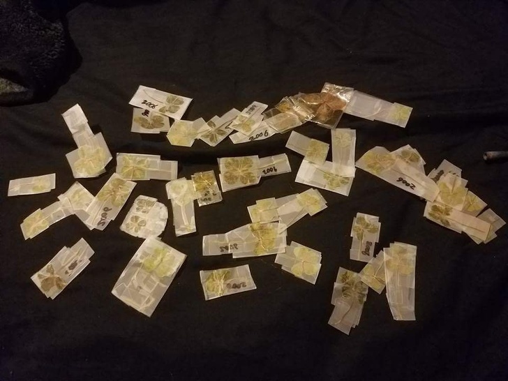 19. “41 tréboles de cuatro hojas y uno de cinco hojas. Los coleccioné en mi infancia y hasta hace poco pensaba que se habían perdido”