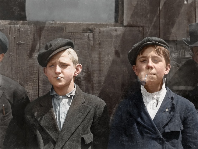 Vendedores de periódico fuman en su descanso, 1910. (Colorización fue hecha más tarde).