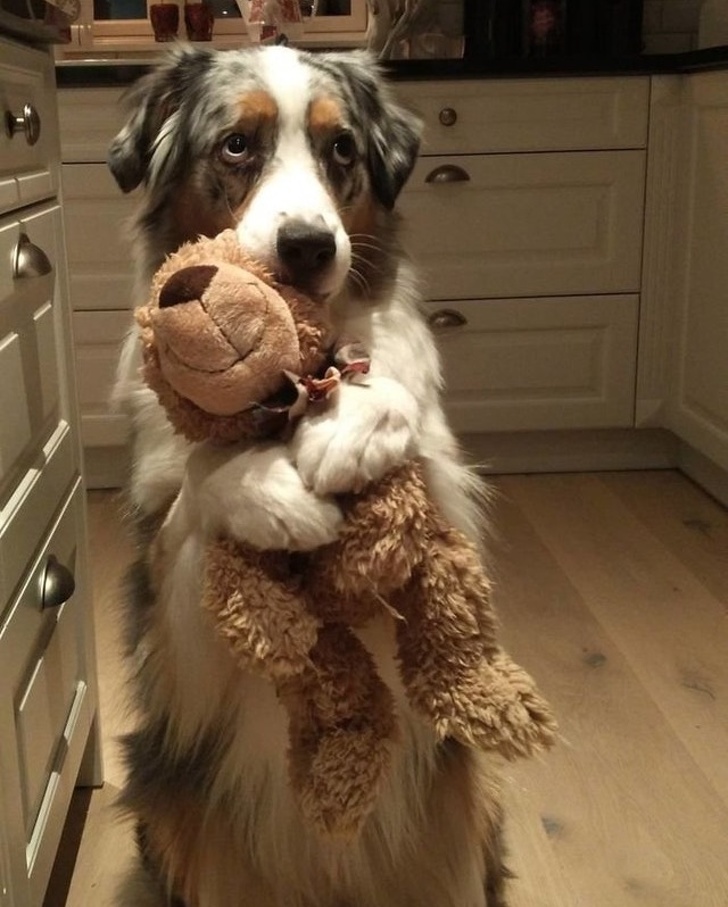 14. “Este es Izzie, un pastor australiano que lleva a su oso a todas partes”