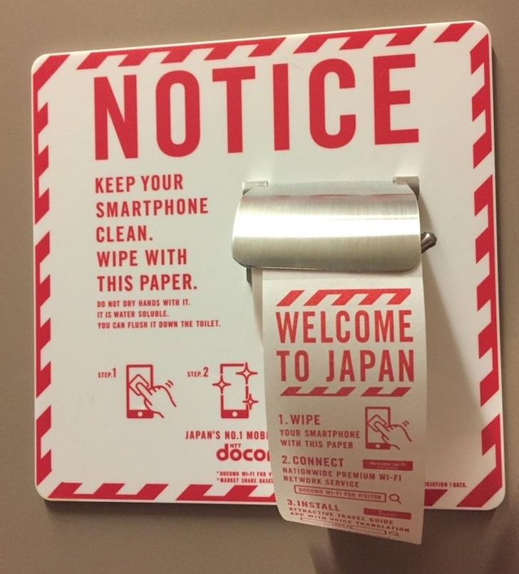 “¡Aviso! Conserva tu teléfono limpio. Límpialo con el papel. No apliques este papel en las manos. Se disuelve en el agua. Tíralo al inodoro. ¡Bienvenido a Japón!”