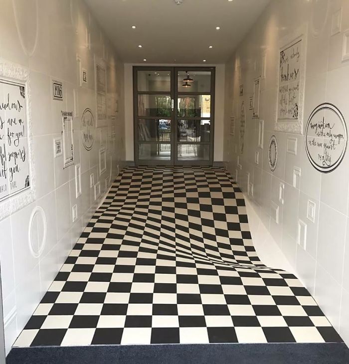11 – Um piso plano com uma ilusão de ótica projetado para impedir as pessoas de correrem no corredor: