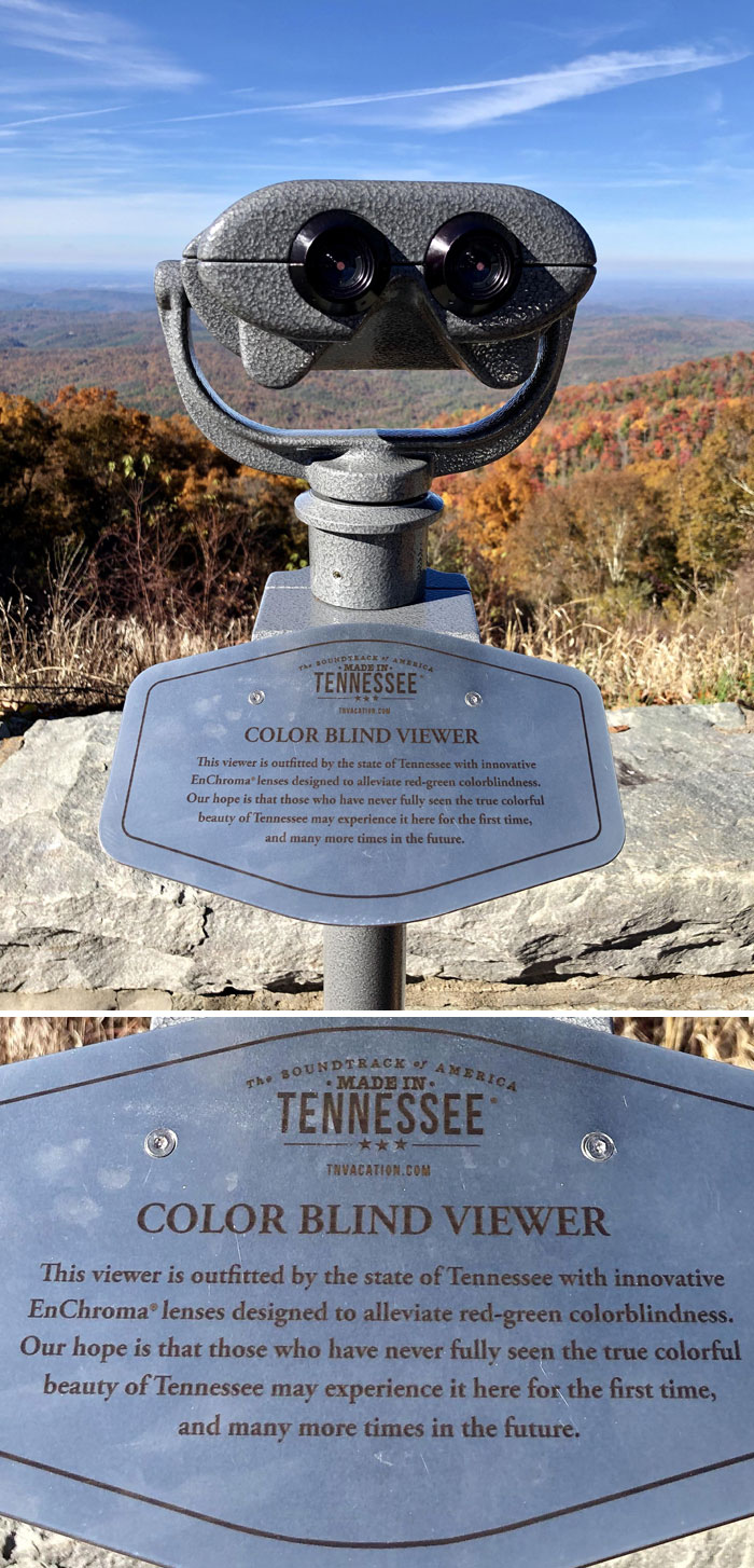 “Essa vista é equipada pelo governo de Tennesse com inovadoras lentes EnChroma feitas para aliviar o daltonismo vermelho-verde. Esperamos que aqueles que nunca viram a verdadeira beleza colorida de Tennesse possam experienciar aqui pela primeira vez e muito mais vezes no futuro”