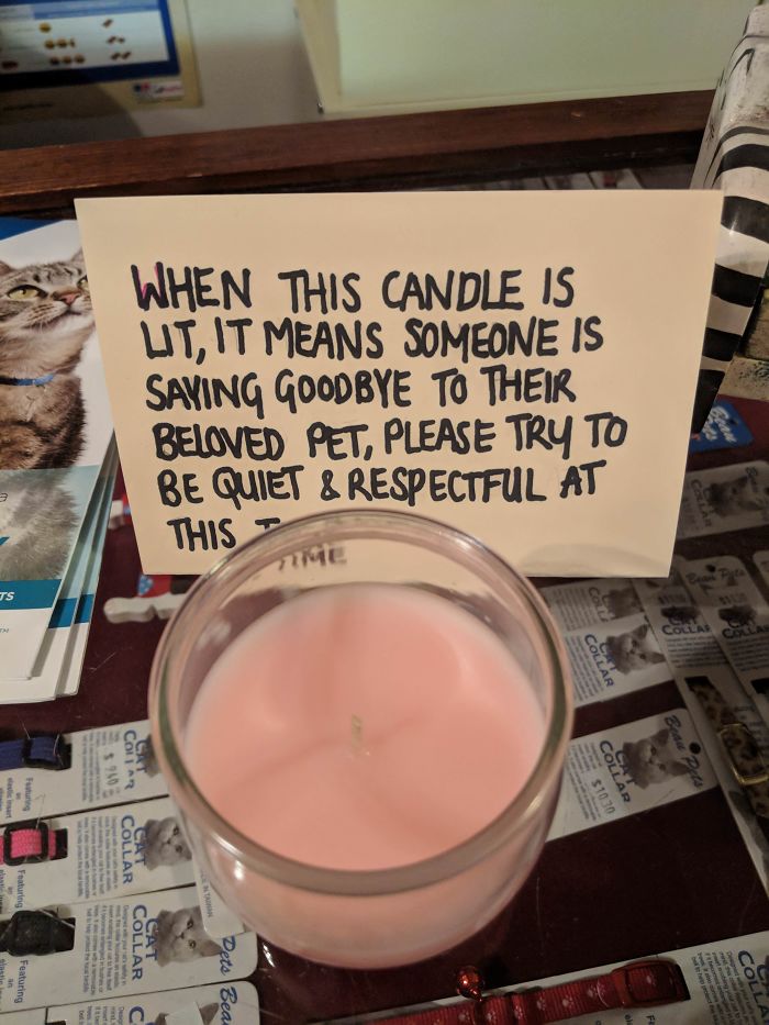 “Quando esta vela estiver acesa, significa que alguém está se despedindo de seu amado bicho de estimação. Por favor, tente manter silêncio e respeitar esse momento”