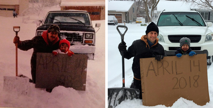 “Después de una fuerte nevada mi hijo yo tomamos la misma foto que hicimos con mi padres hace 35 años”