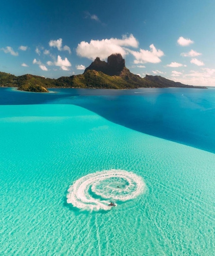 10. Una persona crea formas en el mar en una playa en Bora Bora
