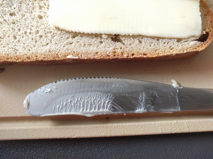 9. Una mancha de mantequilla en un cuchillo que parece un bosque con árboles