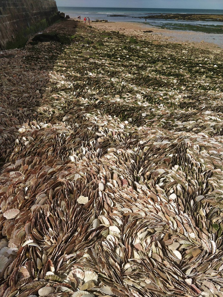4. Estas conchas acumuladas en la orilla de esta playa se ven como hierba siendo sacudida por el viento