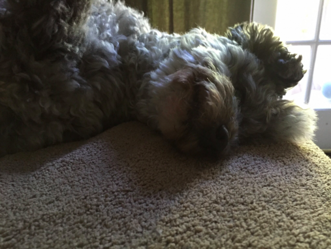 This is Newton. He is a poodle- originally bred to hunt ducks in water. He is terrified of water but will keep your feet warm under a desk for hours. Deals with mailman daily.