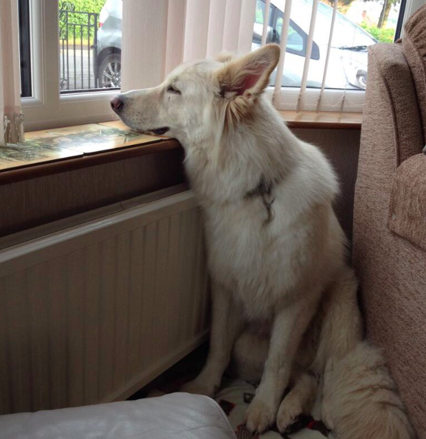 This is our German Shepherd Wolfie. A breed best known for its courage, loyalty & guarding instincts. No matter how tired, Wolfie never leaves his post in the window – bravely guarding us from unruly toddlers on scooters and crazed pensioners waiting for the bus.