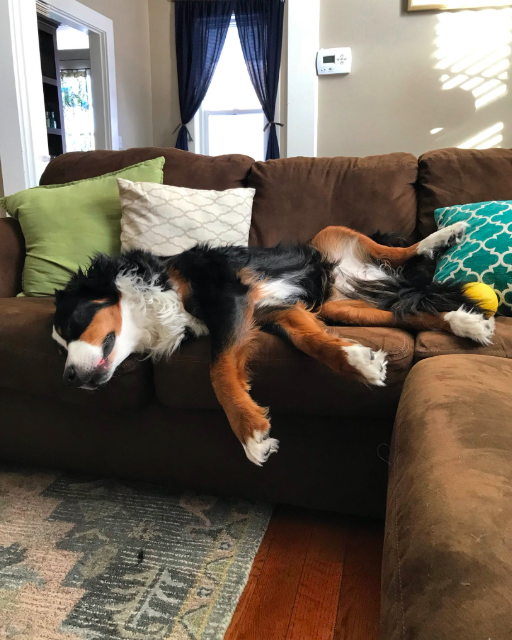Piper is a Bernese Mountain Dog. Bred to protect and move herds of cattle. Also a drafting animal…apparently can pull 10x her weight, so…1200 pounds?! She enjoys sleeping at least 19 hours a day. Occasionally moves from bed to couch.