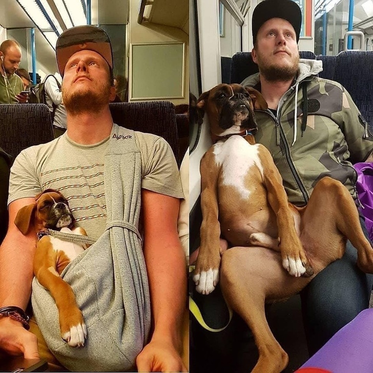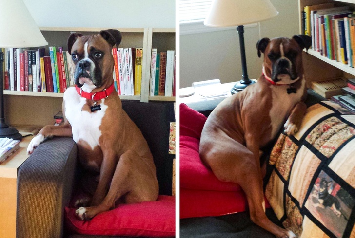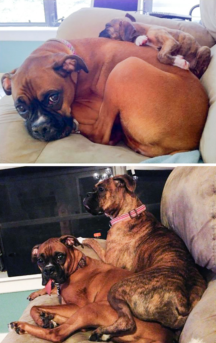 3. “Cachorro bóxer acostado sobre nuestro bóxer adulto. Antes y después”