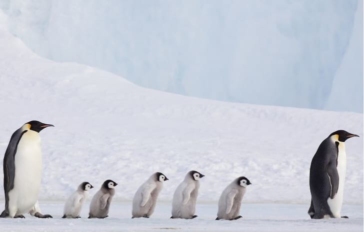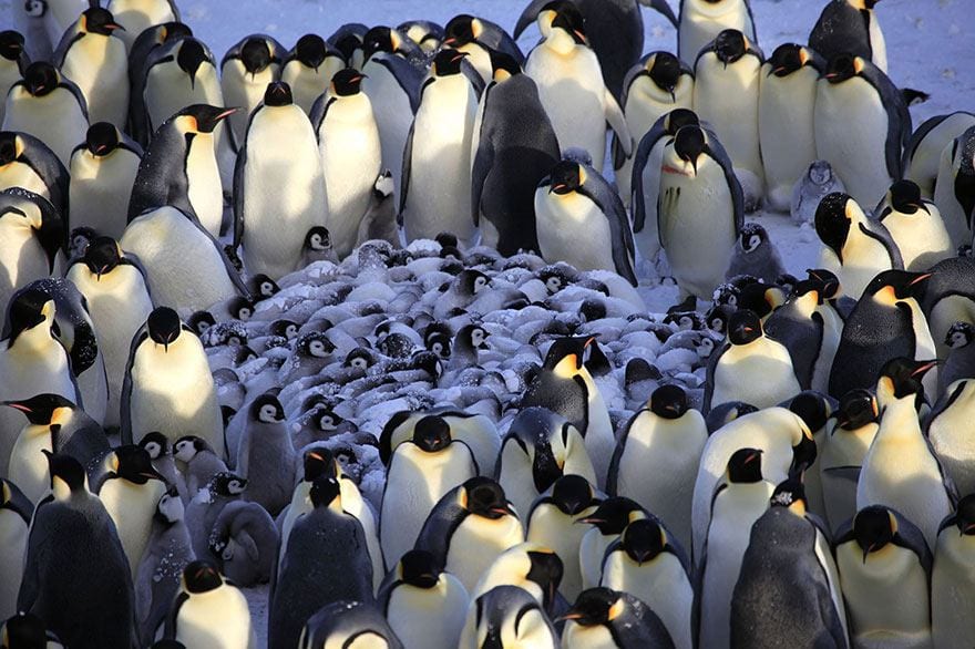 #53 Adult penguins huddling together to shelter their young from the cold wind.
