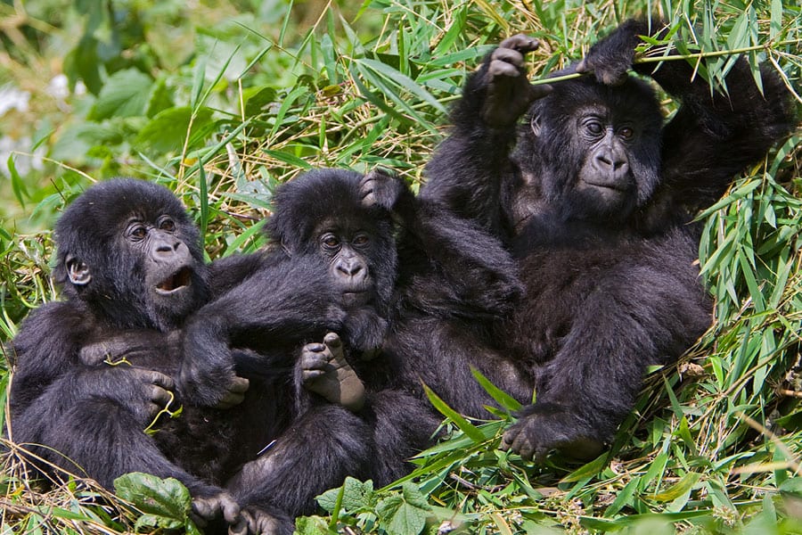 These adorable gorilla babies are probably thinking about their next banana feast.