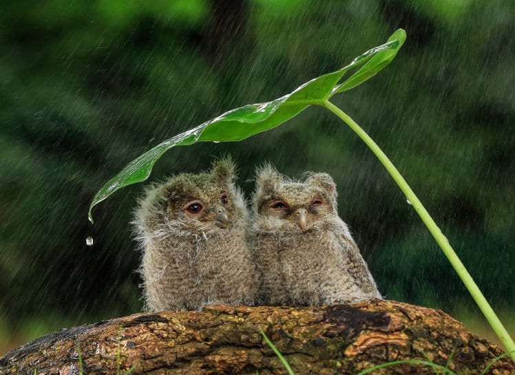 These cute baby owls are caught in an aggressive storm while their mother is most likely out searching for their next meal. At least they have each other to keep warm!