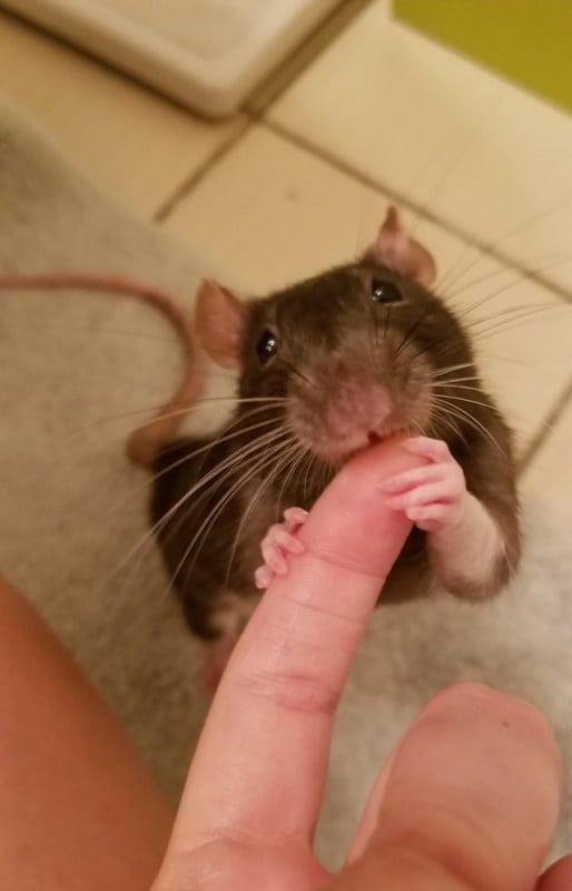 Rats are really smart. In fact, many people compare them to dogs. They can learn tricks, follow commands, and even form close bonds with humans. This little rat doesn’t want to hurt her mom. All she wants to do is play while making sure her mom isn’t hiding any treats. She’s such a polite rat.