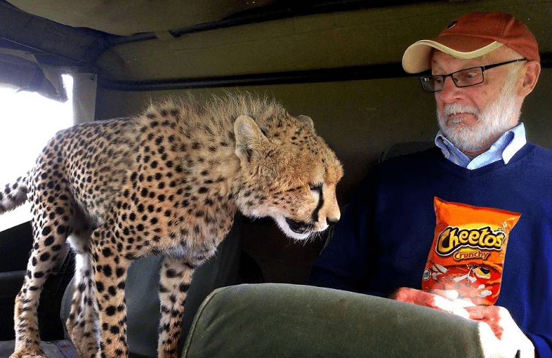 This Cheetah wants those Cheetos really bad, and this man better consider giving them up. Cheetahs are top predators that get what they want. Maybe this Cheetah is named Chester and feels like she deserves the Cheetos since she is pretty much the spokesperson for the brand.