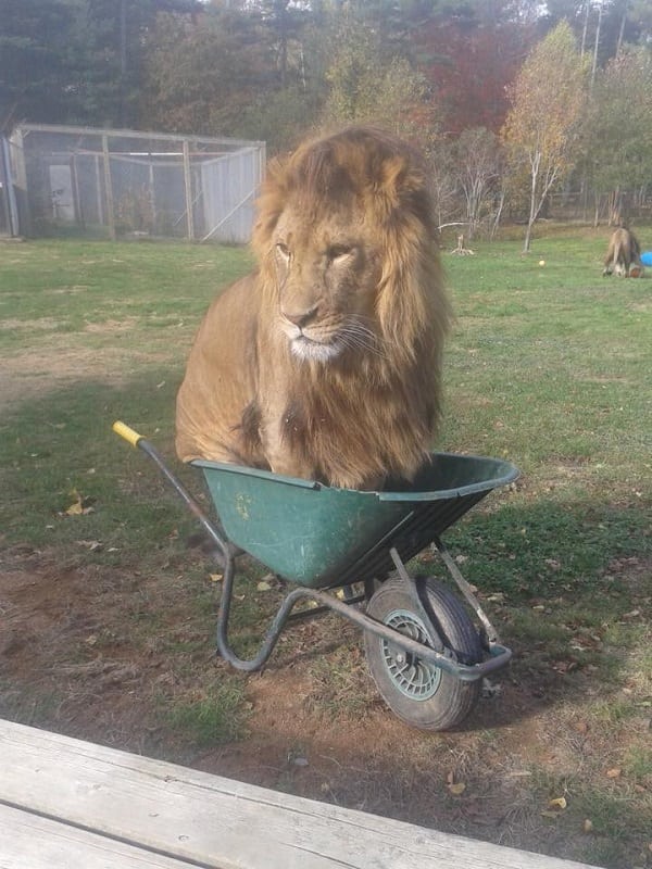 This lion doesn’t realize how big he is, thinking he fits in the wheelbarrow just fine. While his handlers work to clean out his enclosure, he seems to be resting. He is probably hoping they will take him for a ride. That would have been another snap worth sharing.