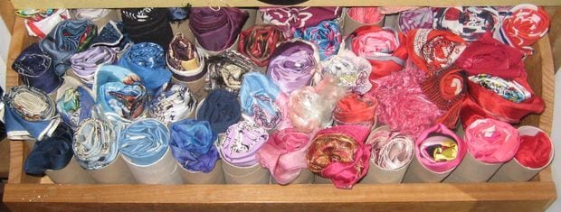 Coloca rollos de papel sanitario en un cajón vacío. Luego enrolla tus bufandas y colócalas dentro de los rollos para que las guardes de un manera más organizada y conveniente.