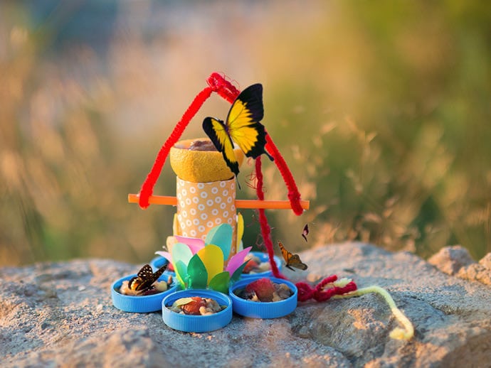 ¿Amas las mariposas? Atráelas creando su propio oasis. Junto con otros suministros como limpiapipas, hilados y algunas frutas secas en tapas de botellas, tendrán su propio pedacito de cielo en tu patio trasero.