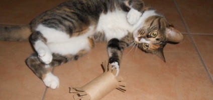 ¡Este es uno de los juguetes para gatos más baratos que puedes encontrar y probablemente también sea el más divertido! ¡Solo corta los extremos del rollo de papel higiénico en franjas finas y mira a tu gatito divertirse!