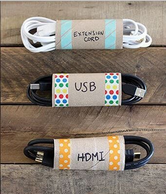 Coloca tus cables dentro de un rollo de papel higiénico para mantenerlos en buen estado y organizados ¡La mejor parte es que no tendrás que desenredarlos! Puedes pintar los rollos o agregar algo de cinta de colores para personalizarlos.