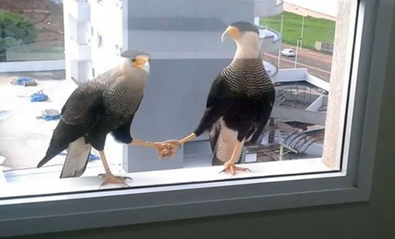 Maybe it’s the looks on their faces, but something about this handshake seems a little suspicious. Either one is trying to scam the other, or they are up to no good together. What kind of deals do birds make with each other? I don’t think I want to know the answer to that.