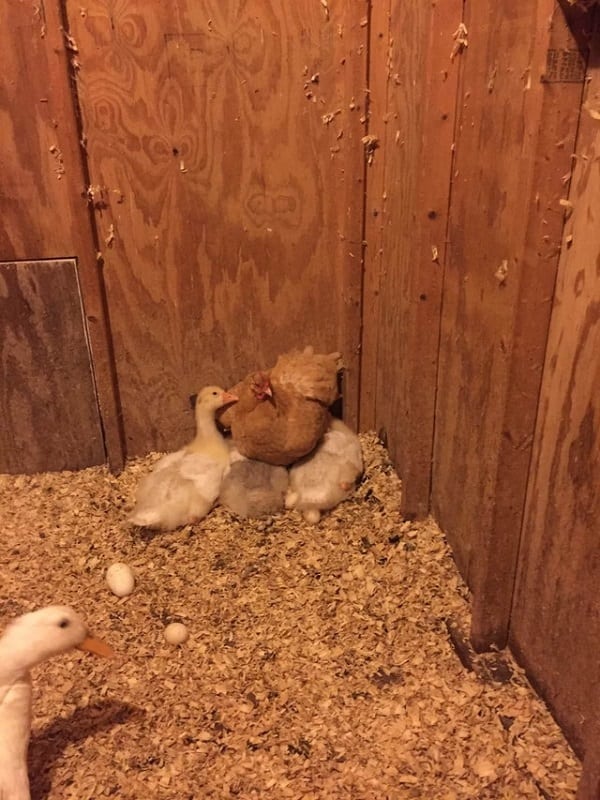 Some animals are naturally great mothers. That instinct is so strong that they will even mother babies that aren’t their own. This hen hatched these baby ducks, and now she treats them as if they belong to her. She seems proud of them, and they don’t mind it one bit.