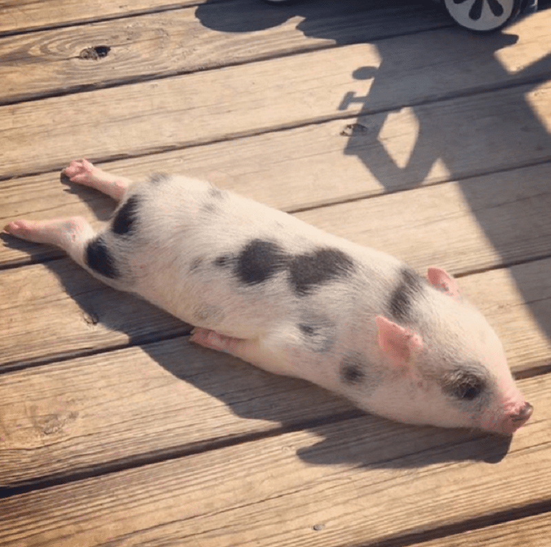 This little piggy better be careful. Staying in the sun too long, and the neighbors might start to smell bacon. She is just relaxing on the deck, soaking up the rays. She is the epitome of relaxation in this photo. She must be planning a beach vacation soon.