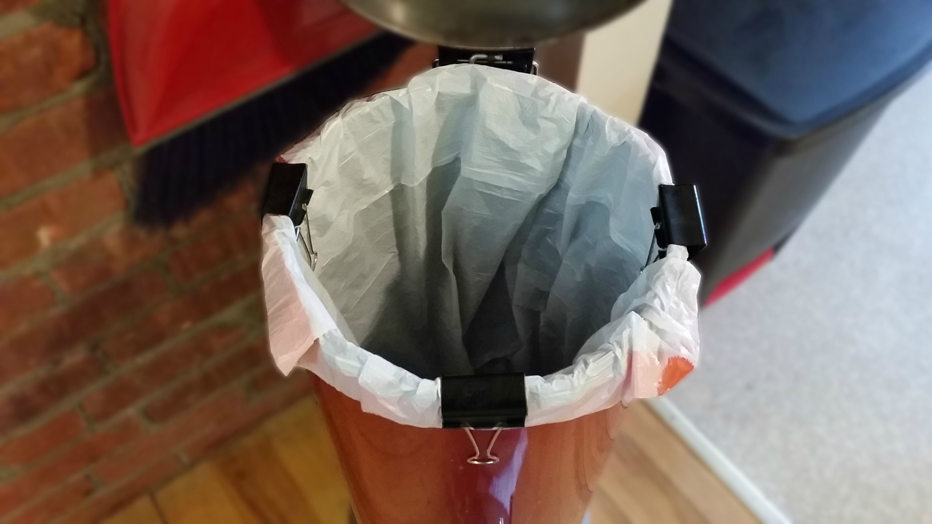 Keep trash bags in place by using a binder clip. This works astonishingly well!