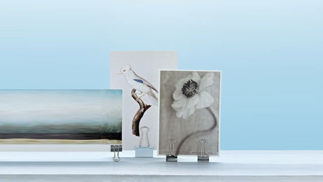 Craft frameless photos using binder clips. It’s not only economical, but also makes pictures easily interchangeable.