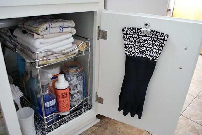 Where do dishwashing gloves go when they’re not in use? No one truly knows! Hang dishwashing gloves under the sink using a binder clip.