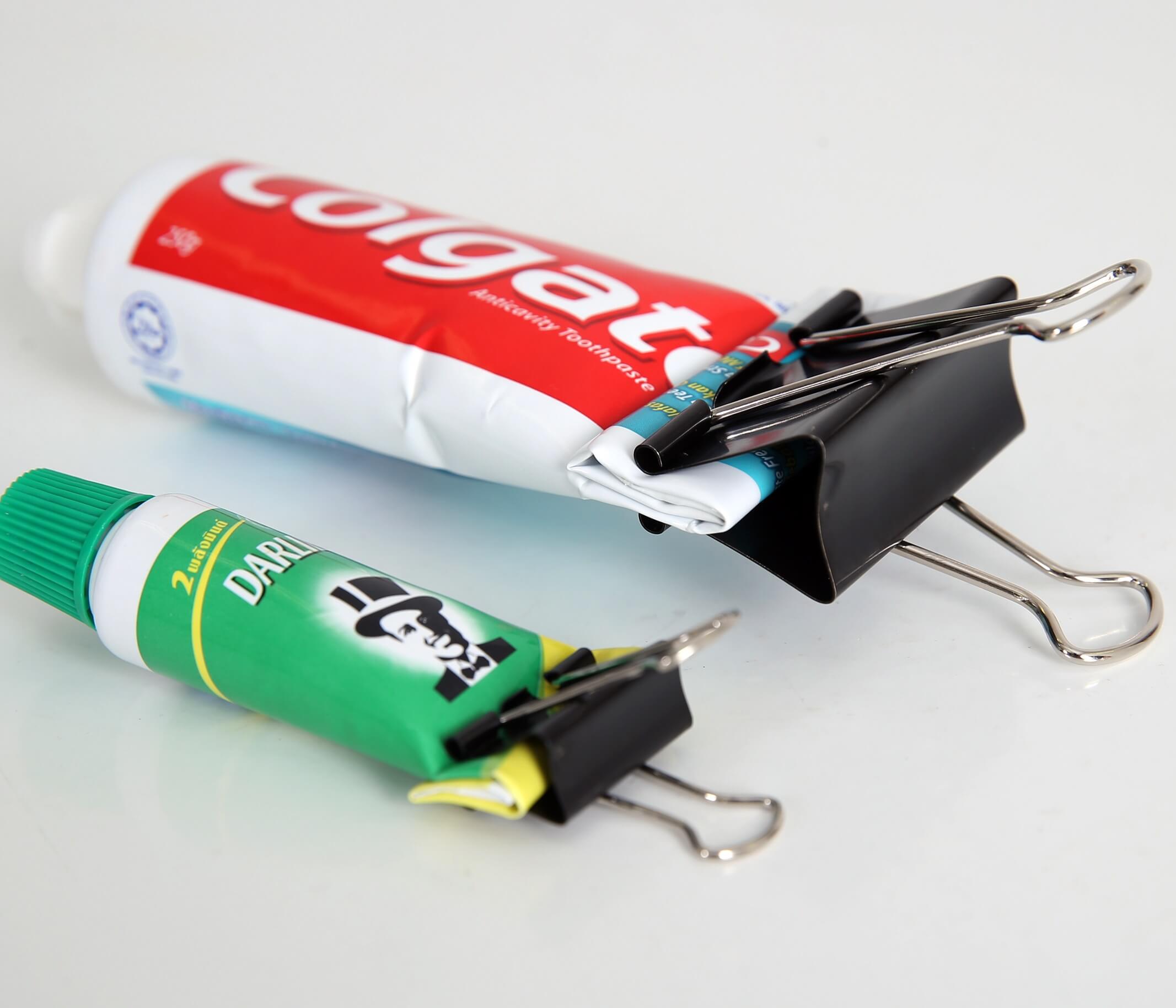 Squeeze every last drop out of your toothpaste, or any other tube, using a binder clip. Simply roll the empty tube and clasp it with the clip. This technique pushes all the paste forward, maximizing the product.