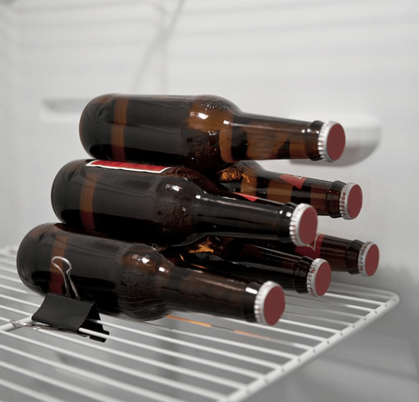 It’s always difficult to lay glass bottles down in the fridge. Prevent bottles from rolling around by simply using a binder clip. Stack and enjoy!