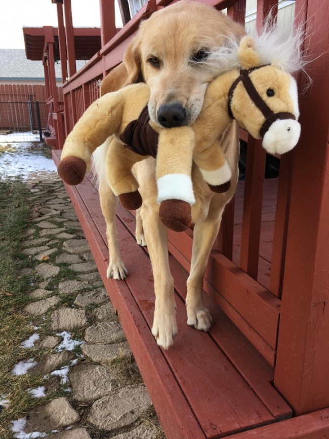 Valoran mucho nuestros regalos. Por ejemplo, este perro no dejó que este caballo se le saliera de los dientes por más de dos horas