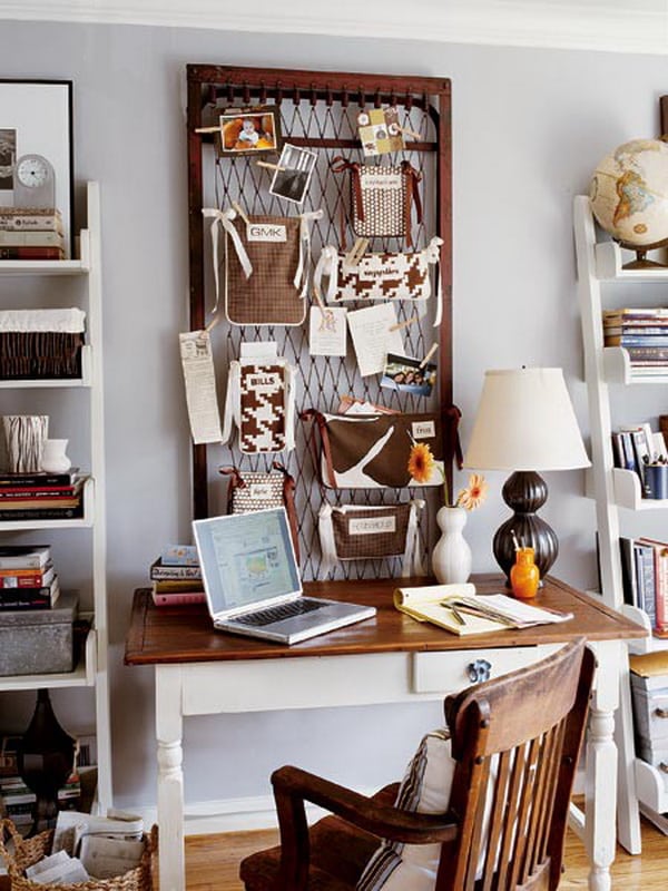 Old full mattresses or crib mattresses can also be used as an office organizer. Just affix the fram to a wall. Then tie organizers to it to hold your bills and other office items.