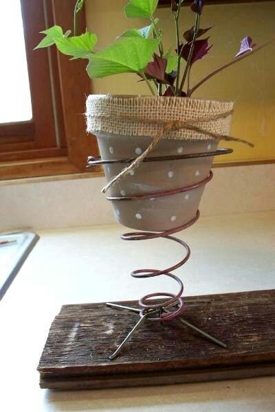 Create a funky planter holder with mattress springs. This project uses a piece of wood to hold the spring in place. Just pop a small planter in the top.