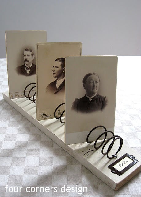 Use springs to display photos upright. Attach some springs to a horizontal piece of wood. Place the photos in between the springs.