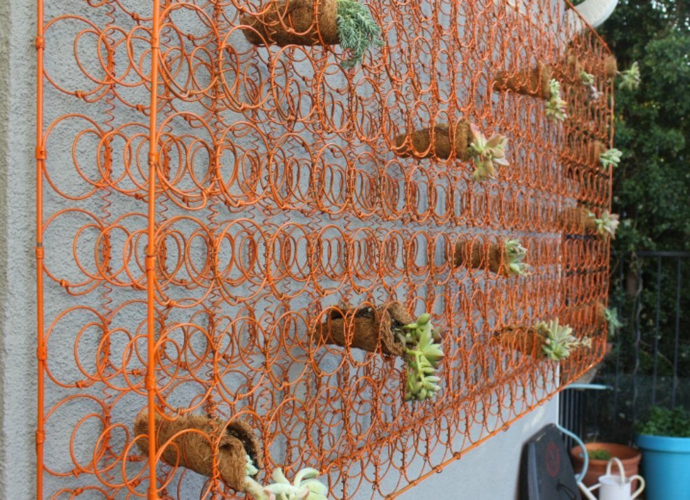 The inside of your planter can be used to create a beautiful garden planter. Just pull away all the fabric to reveal the inner frame and springs. Place it on the wall and fill the spring holes with tiny plants.