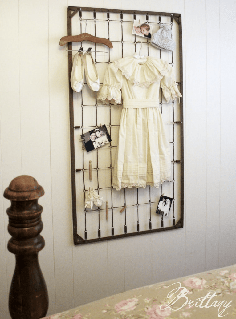 You can make a memory board from an old mattress or crib frame. Mount your frame to the wall. Then add keepsakes to it.