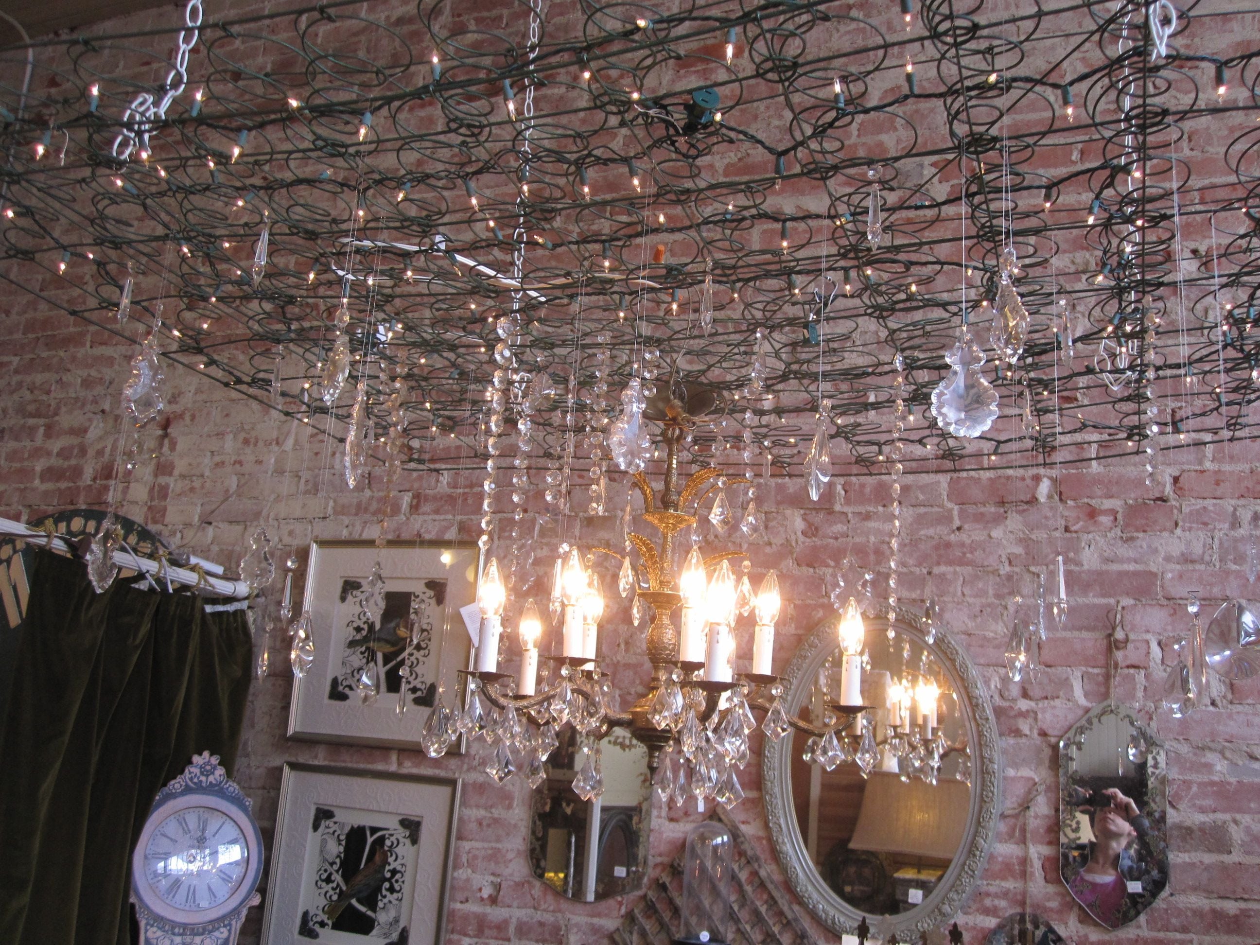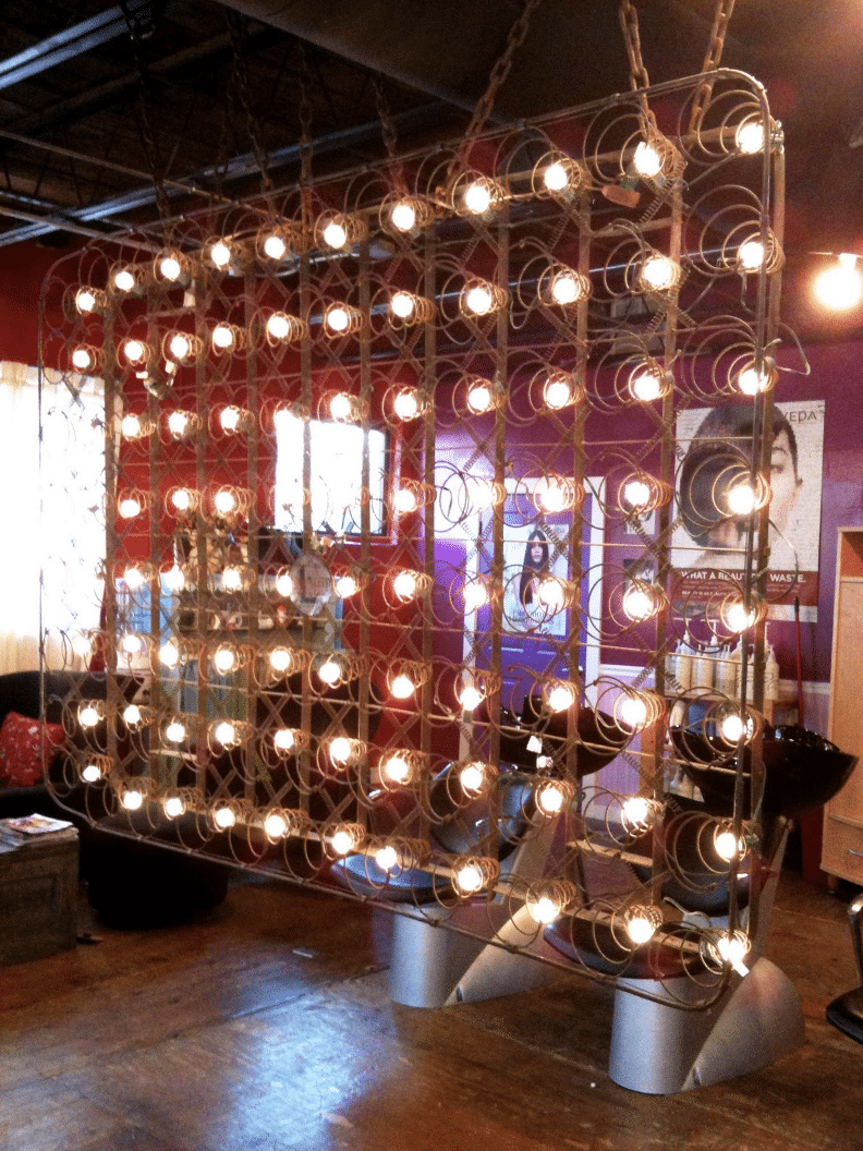 Turn your old mattress into a chandelier. Just pull out the inside and hang the mattress spring from the ceiling. Then hang crystal, lights, and other items from it.