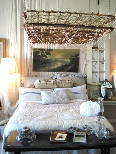 Create a beautiful display above your bed with the inside of an old mattress. Hang it from your ceiling. Then run string lights and crystals through it.