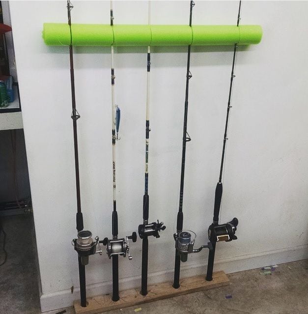 Prenda um espaguete de espuma horizontalmente na parede e faça alguns cortes na vertical. Encaixe as varas de pesca entre os cortes.
