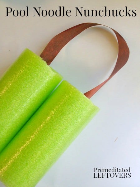 Se quiser organizar uma festa com o tema das Tartarugas Ninjas ou fazer um brinquedo diferente para as crianças, faça estes nunchakus de espaguete de espuma. Corte dois pedaços de espuma verde e prenda com uma fita marrom. As crianças farão uma algazarra, mas sem ninguém se machucar!