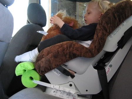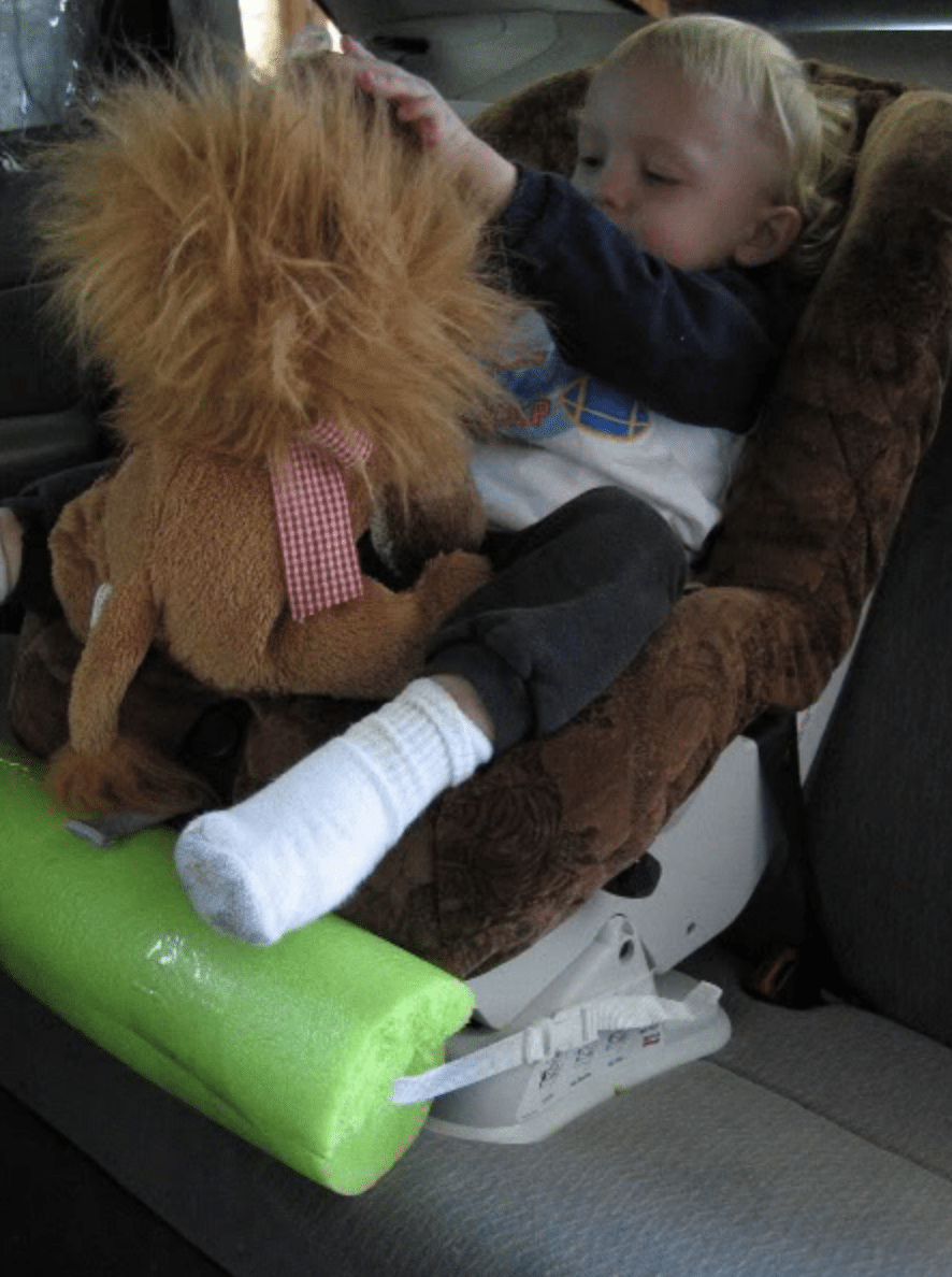 Seu filho pequeno vive chutando o assento do carro? Prenda um espaguete na borda da cadeirinha para que ele tenha onde colocar o pés.