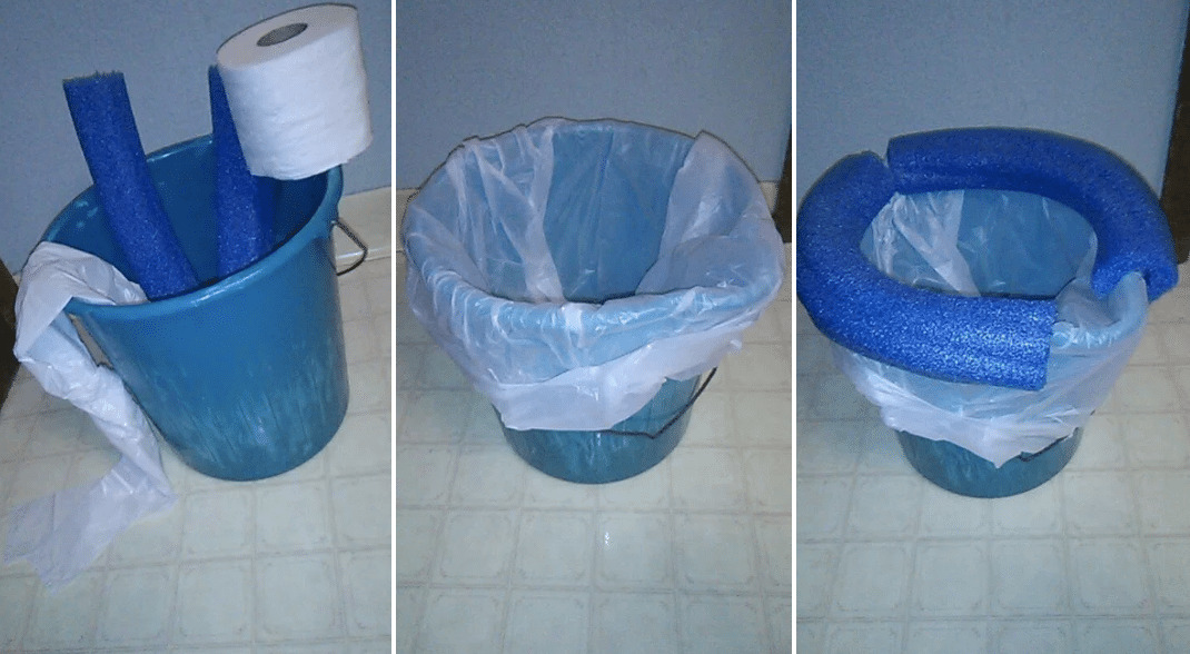 Quando for acampar, você pode fazer este vaso sanitário super fácil. Primeiro, cubra um balde com sacola plástica. Depois, corte dois pedaços de espaguete de espuma ao meio e encaixe-os no balde para criar o assento.