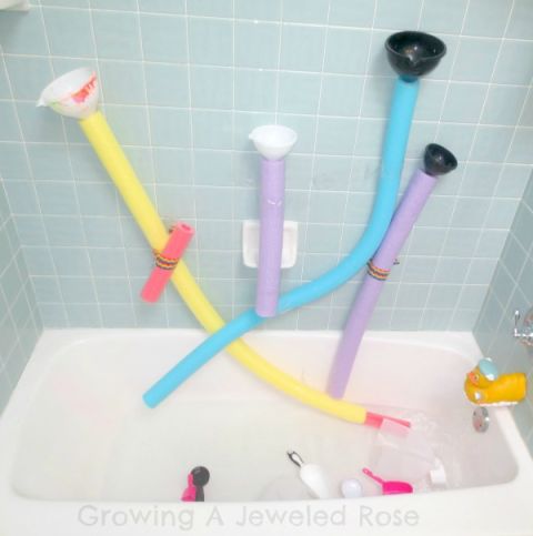 Use espaguetes de espuma para criar um parque de diversões e distrair seus filhos durante o banho. Isso tornará a experiência mais agradável, e logo seus filhos vão começar a perguntar pela hora do banho!