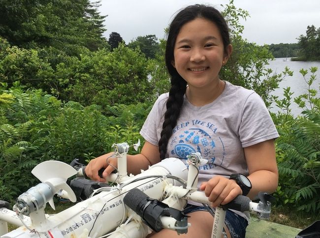 Esta invenção foi projetada por Anna Du, uma aluna da 6ª série. Seu robô é um veículo operado remotamente que emprega luz infravermelha para detectar e caçar microplásticos. Ele é composto de dois sistemas diferentes: um sistema de navegação que o guia pela água, e um sistema de detecção que usa uma câmera infravermelha de alta resolução para encontrar plásticos no oceano.